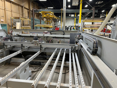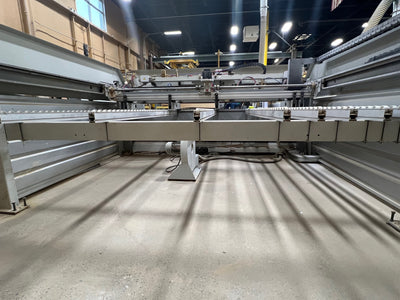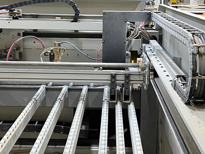 Front loading; 126" max. cutting length; 122" max. pusher stroke; 12 HP main saw motor; 2.4 HP scoring motor; 3.35" max. blade projection; feed speed of saw carriage variable 0 to 197 FPM; programmable pusher fence with (6) material grippers; pusher fence speed 60 FPM forward and reverse; 3.35" max. gripper opening; AC Servo drive of saw carriage and pusher; automatic side squaring device; (3) air flotation tables; PC front end; on-board optimizing; 350 mm main blade; 200 mm scoring blade; machine weight - 11,499 lbs.; overall footprint - 19'5" wide x 22" deep