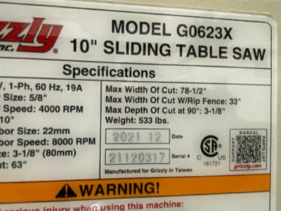 Grizzly G0623X 10" Sliding Table Saw 5 HP, 1 PH Multi-Box S/N: 21120317 - AZ
