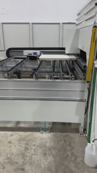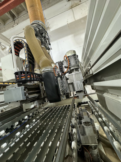 CNC through feed machine center with drilling, grooving, & routing of panels from top & bottom to produce two parts at a time