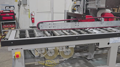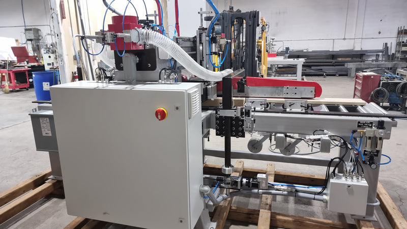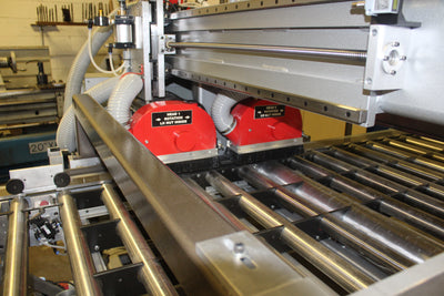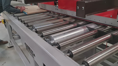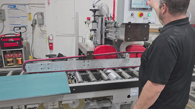 The tape, which acts as the hinge for miter folding, is applied automatically and cut to length. The feeder belt moves the material over the high-precision, stainless steel roller bed to minimize friction and reduce or eliminate marring of the material. The v-groove is being applied from above. Motorized set-up features and other gadgets add to the operator convenience for this machine. Both linear as well as cross cuts up to 14.5" (standard), and 24.5" (optional) away from the fixed fence are possible.