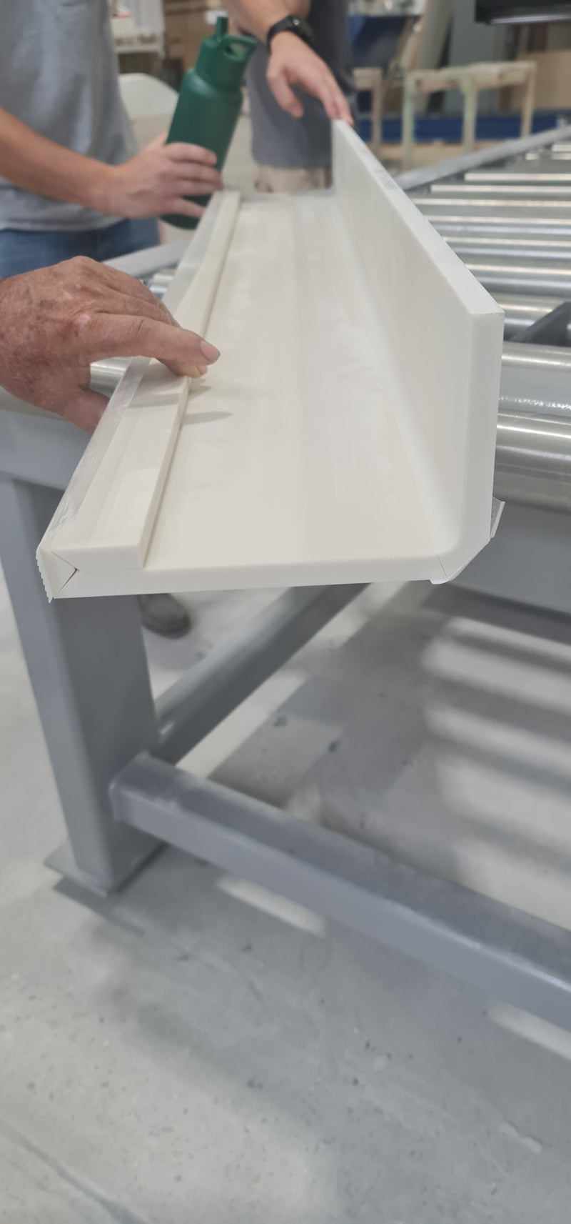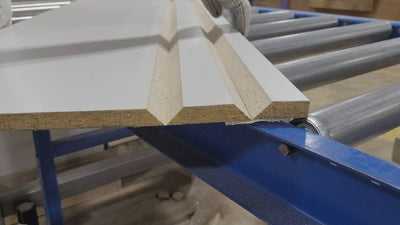 V-Folds to create a build-up front edge, cove back splash profile, scribe strip, triple fold profiles, dado for back panel, double edge shelving etc. This machine comes standard with all available options for enhanced operator convenience and performance. Other v-groove angles besides the standard 90 degrees can easily be employed.